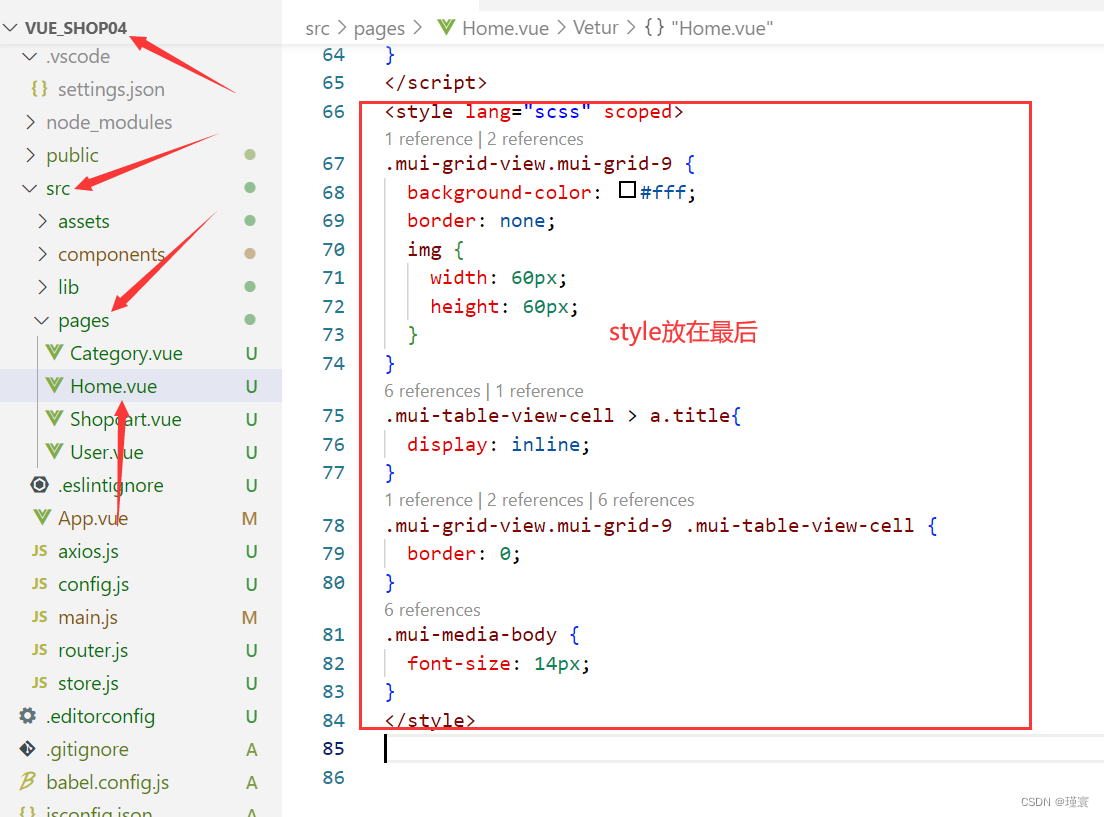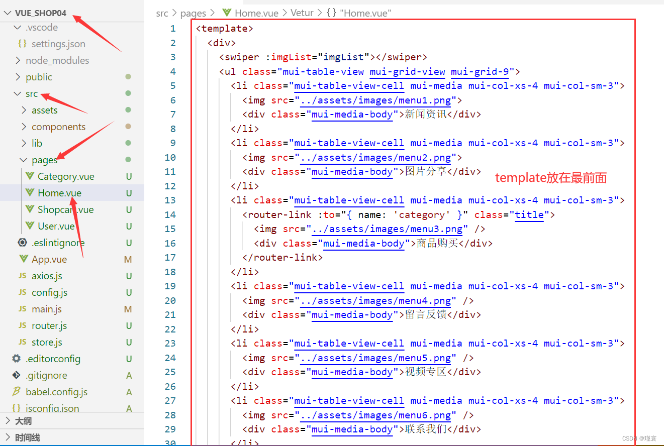 首页和商品详情页都有图片轮播图展示,考虑到Vue组件代码的复用性,把轮播图相关代码单独放置在src\components\swiper.vue文件中。