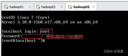 分别在hadoop01、hadoop02、hadoop03中输入root 和自己设置的root用户密码进入root用户