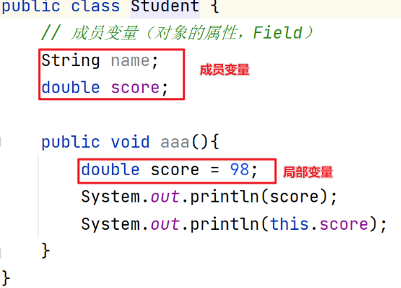如下图所示,成员变量在类中方法外,而局部变量在方法中。