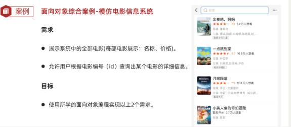 学习完面向对象的语法知识之后。接下来,我们做一个面向对象的综合案例——模仿电影信息系统。如下案例出自b站黑马程序员java基础ppt。