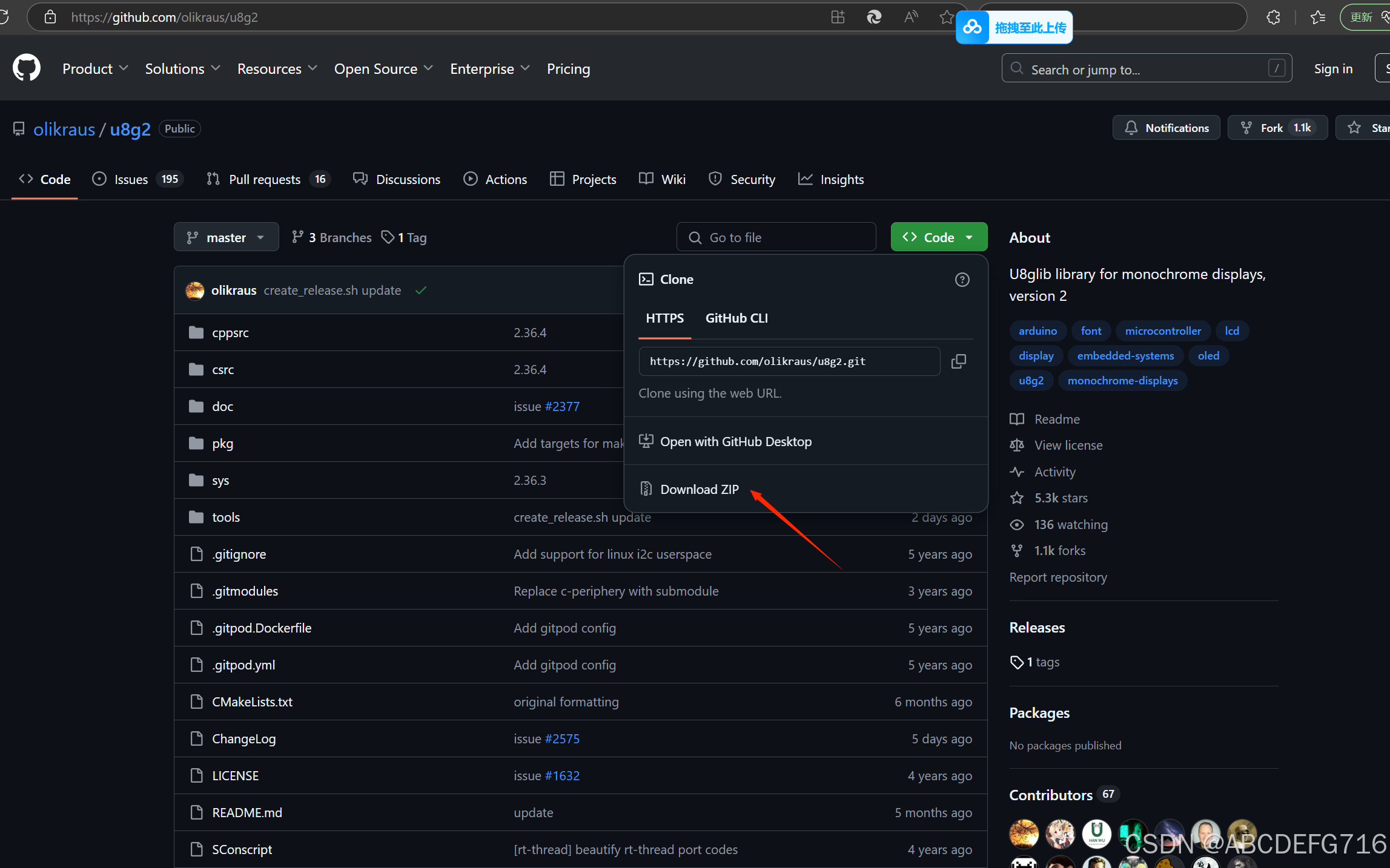 步骤1:在github上下载u8g2库的压缩包GitHub - olikraus/u8g2: U8glib library for monochrome displays, version 2