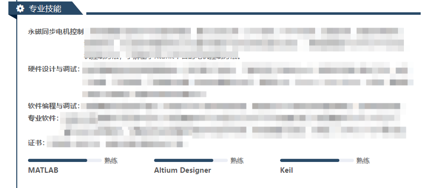 3. 专业技能——专业技能是展现自己实力的重要一部分,在说明自己的专业技能时,要表述清晰准确,做好不同类别技能的分门别类,这能让面试官清晰的了解求职者的能力构成,切勿在专业技能这一部分直接写一大段话。