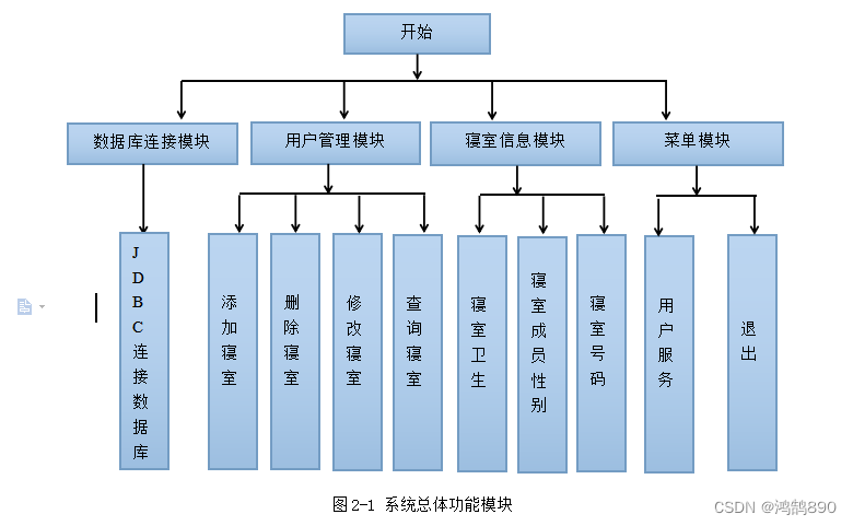 本章通过需求分析将系统分为四个功能模块,分别为数据库连接模块、用户管理模块、寝室信息模块、菜单模块基于业务流程完成了系统数据库的设计。