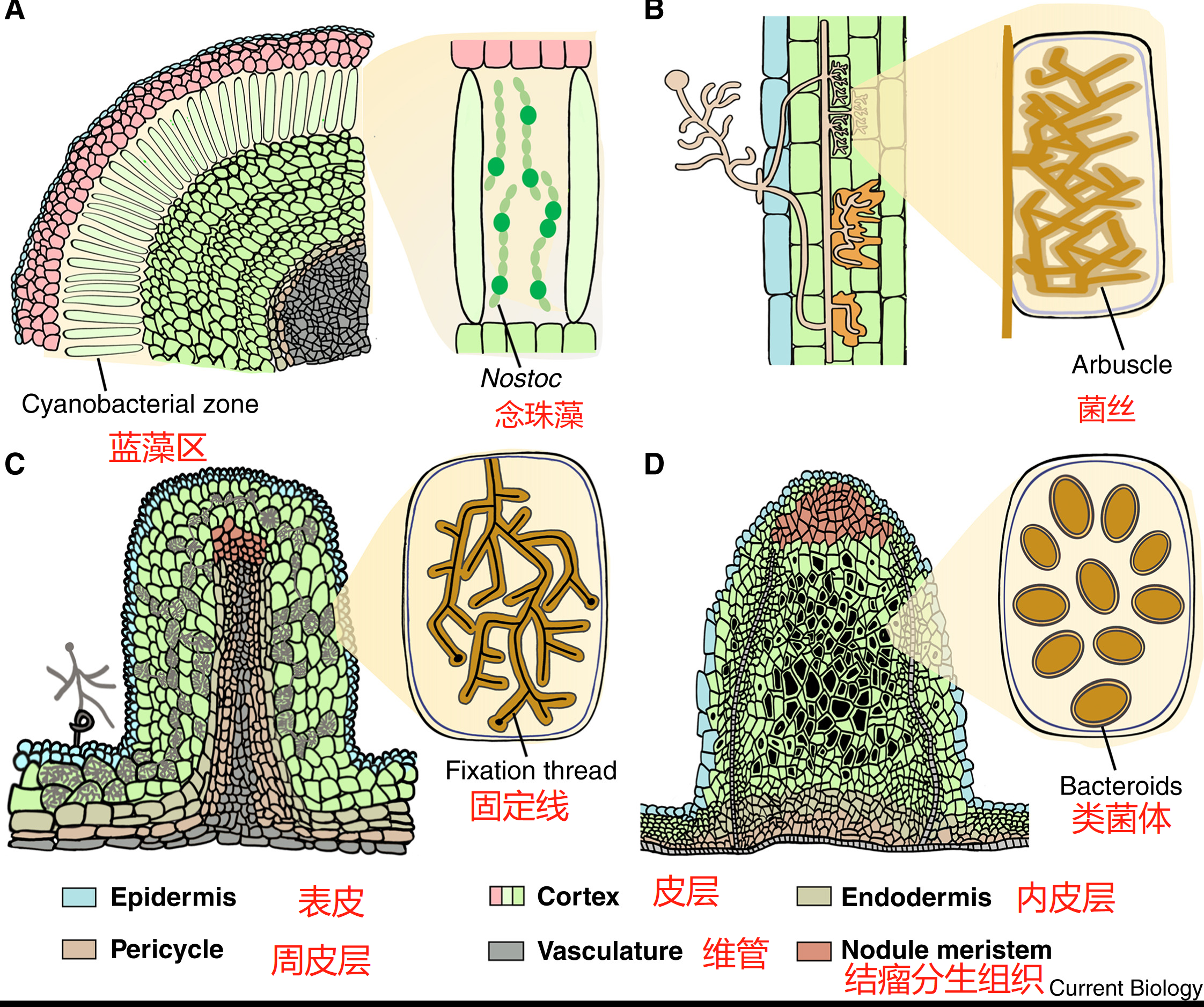 (A)蓝藻-苏铁共生。苏铁中珊瑚根与蓝藻共生的横截面的插图。(B)丛枝菌根共生。(C)弗兰克氏放线根瘤。(D) 蒺藜苜蓿的不定型根瘤