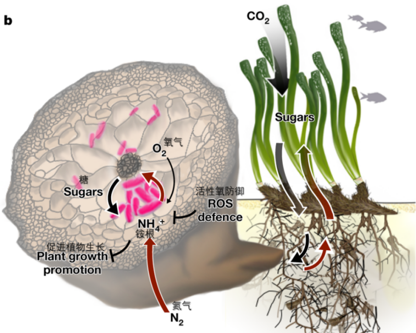 海草大约在 1 亿年前从陆生开花植物进化而来,这些植物迁徙回海,在全球沿海环境中形成了广阔的草地。郁郁葱葱且高产的海草草甸通常在营养缺乏的水域中茁壮成长。由于植物和细菌之间的关联共生关系已从许多陆生草中发现,据推测微生物对氮气固定可能是海草氮的重要来源。最近,在整个地中海温暖水域繁殖的海草 Posidonia oceanica 的成功归功于与海洋细菌 Candidatus Celerinatantimonas neptuna 的陆生型固氮共生关系。这种固氮细菌生活在大洋松根细胞之间和内部,在那里它为宿主提供氨和氨基酸以换取糖。这种细菌属于γ-变形菌,存在于世界各地的沿海生态系统中,与之前从盐沼草样本中分离出的细菌的相似性为95%,表明它们可能与其他海草和盐沼植物形成类似的共生关系。