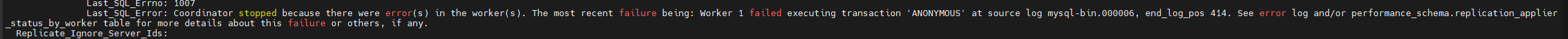 Last_SQL_Error: Coordinator stopped because there were error(s) in the worker(s). The most recent failure being: Worker 1 failed executing transaction 'ANONYMOUS' at source log mysql-bin.000006, end_log_pos 414. See error log and/or performance_schema.replication_applier_status_by_worker table for more details about this failure or others, if any.