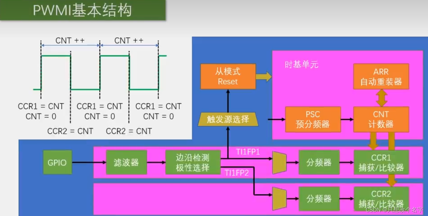 输入捕获模式下,当通道输入引脚出现指定电平跳变时,当前CNT的值将被锁存到CCR中,可用于测量PWM波形的频率、占空比、脉冲间隔、电平持续时间等参数每个高级定时器和通用定时器都拥有4个输入捕获通道可配置为PWMI模式,同时测量频率和占空比可配合主从触发模式,实现硬件全自动测量。
