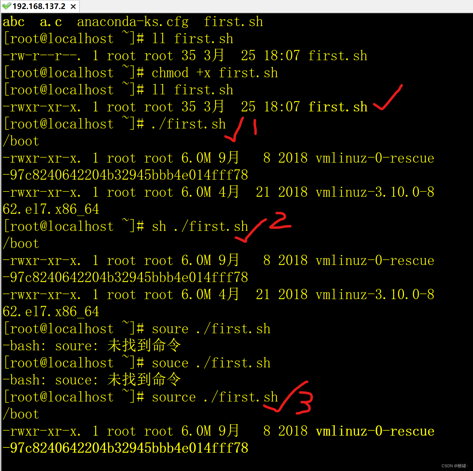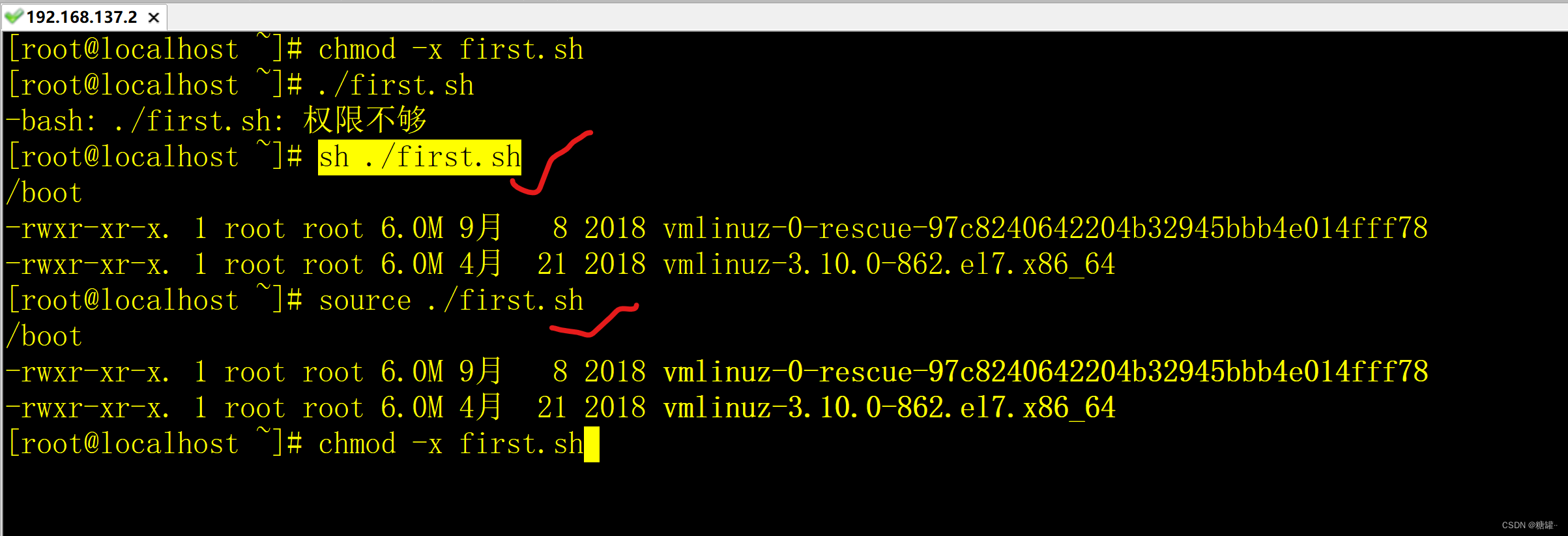 [root@localhost ~]# chmod +x first.sh(+x前不写用户或组,默认所有人都给X权)
