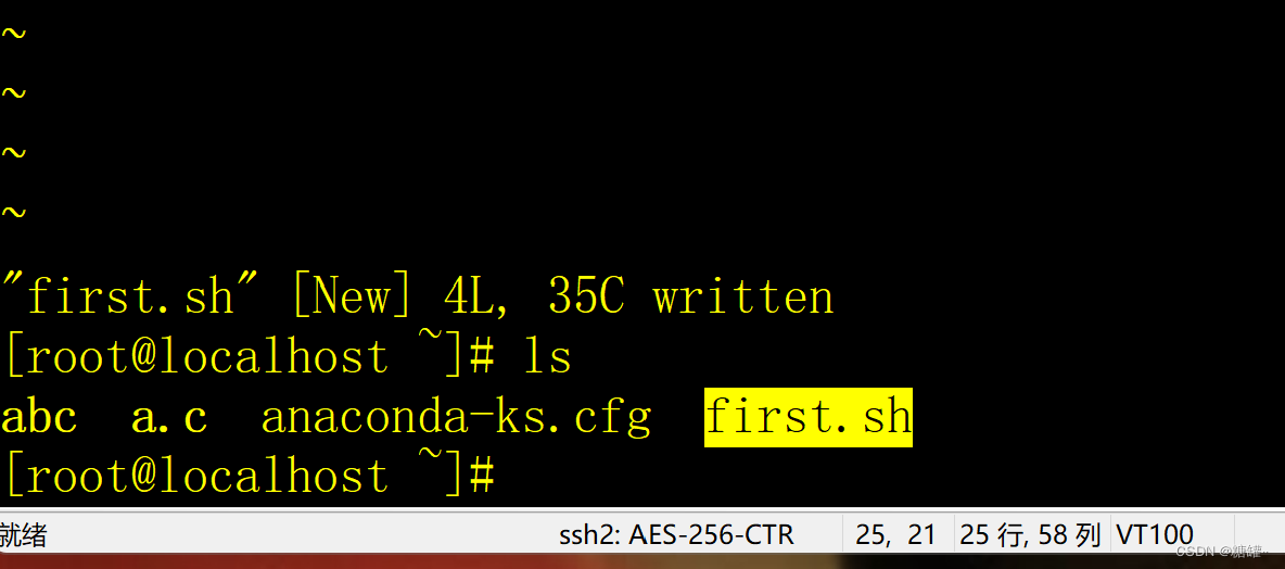 wq存盘后,ls确认当前目录(/root)有first.sh