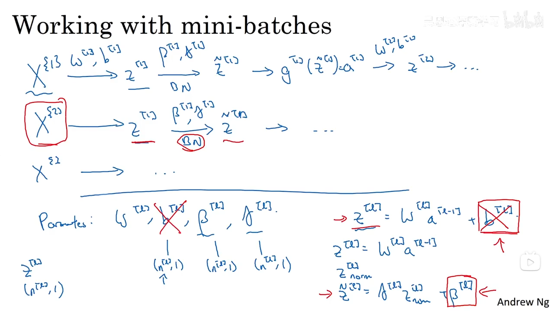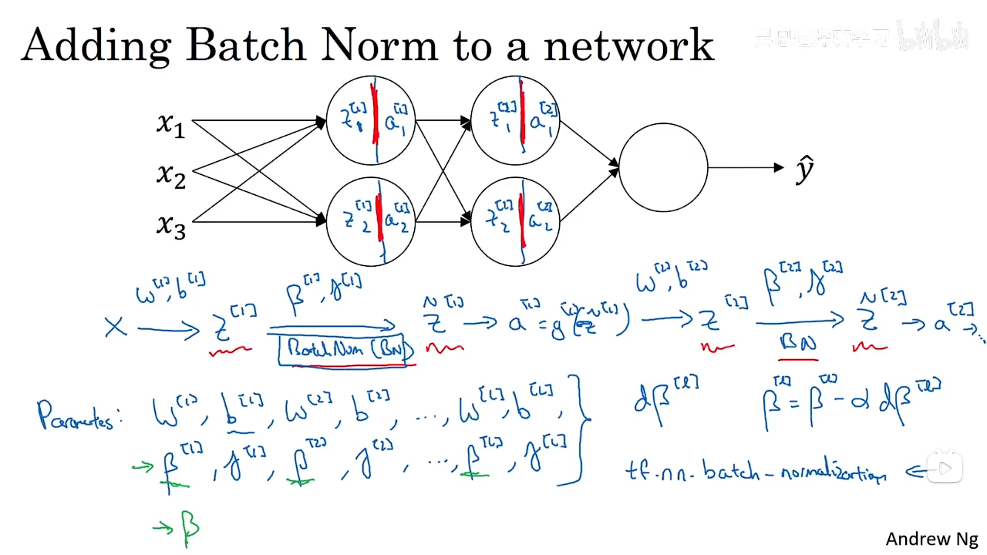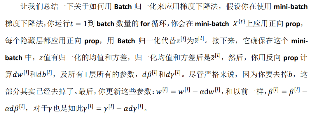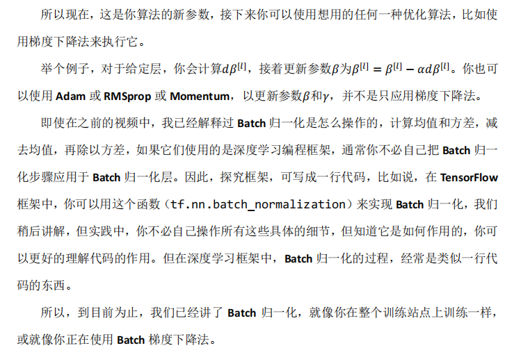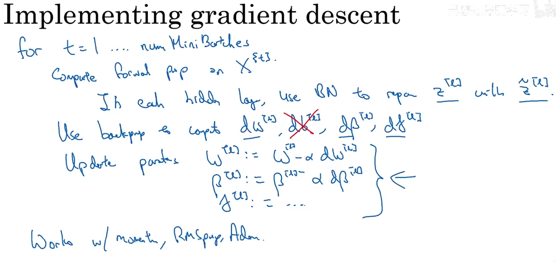 如果你已将梯度计算如下,你就可以使用梯度下降法了,这就是我写到这里的,但也适 用于有 Momentum、RMSprop、Adam 的梯度下降法。与其使用梯度下降法更新 mini-batch, 你可以使用这些其它算法来更新,我们在之前几个星期中的视频中讨论过的,也可以应用其 它的一些优化算法来更新由 Batch 归一化添加到算法中的𝛽 和𝛾 参数。接下来,我们将所有东西放在一起,描述一下如何使用批量归一化实现梯度下降。