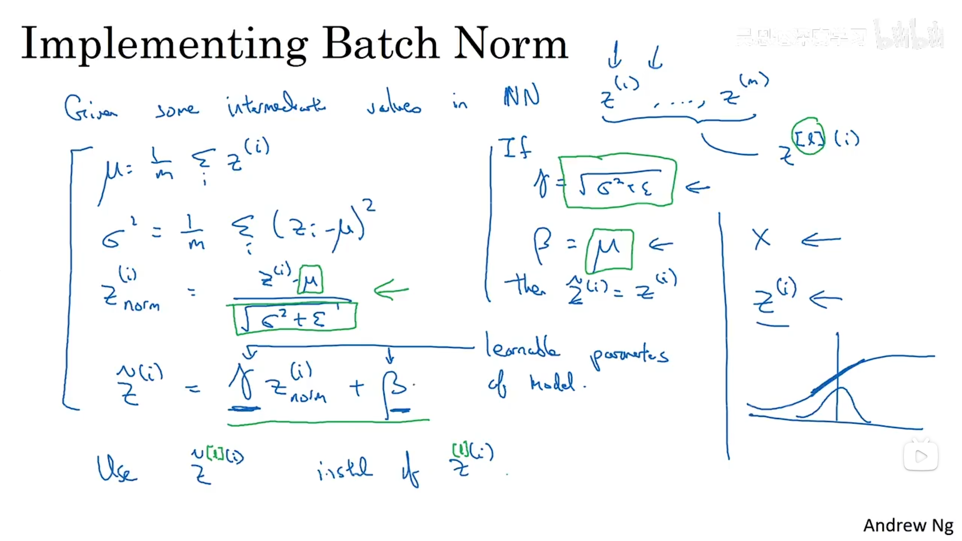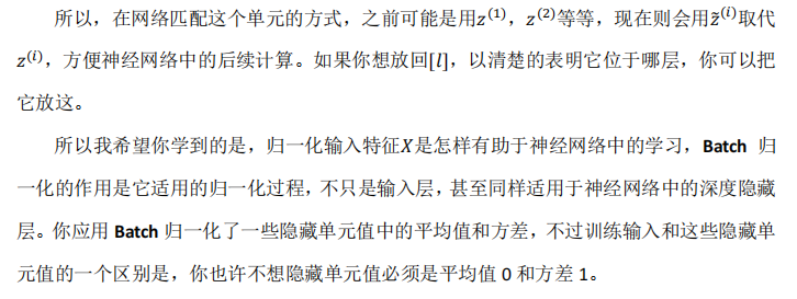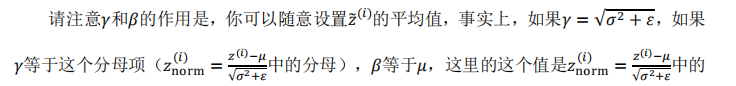 同样的方法,我们也可以对神经网络中的某一层隐藏层进行归一化,将所有数据对应的z的值-均值/标准差,这里在里面加入一个epsilon是为了保证数据的稳定性。这样就将z归一化为均值为0,方差为1的数据。但是所有的隐藏层不可能都是均值为0,方差为1的数据,隐藏单元有不同分布才更有意义,因此我们将计算称为z tilde的值。