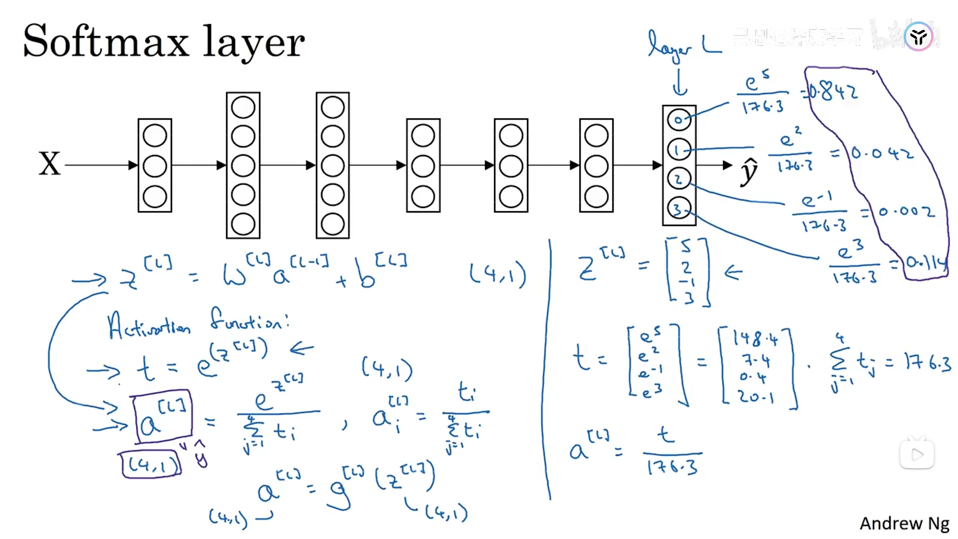 softmax的计算方法图中已经标明了,重点就是其中我们需要对z求指数次方,然后进行归一化,计算出来的值就代表这个数据属于某个类别的概率,和为1。