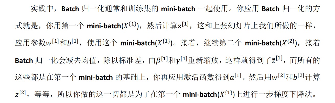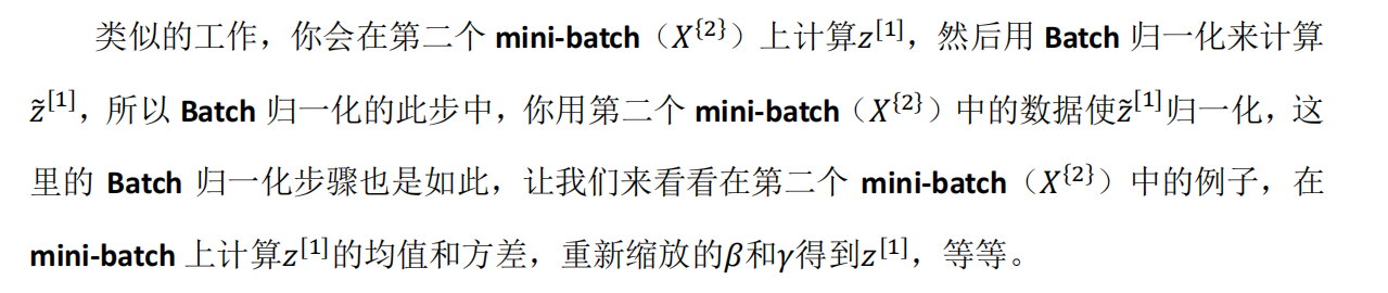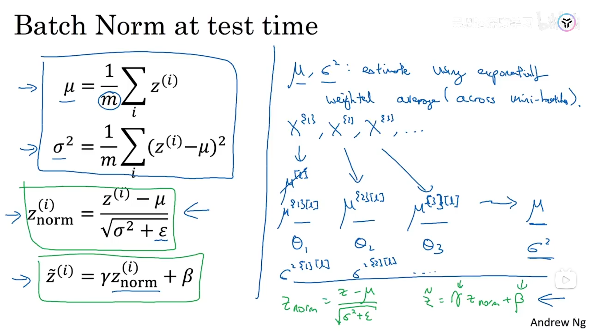 在实际操作中,我们通常运用指数加权平均来追踪在训练过程中你看到的𝜇和𝜎2的值。还可以用指数加权平均,有时也叫做流动平均来粗略估算𝜇和𝜎2,然后在测试中使用𝜇和𝜎2的值来进行你所需要的隐藏单元𝑧值的调整。