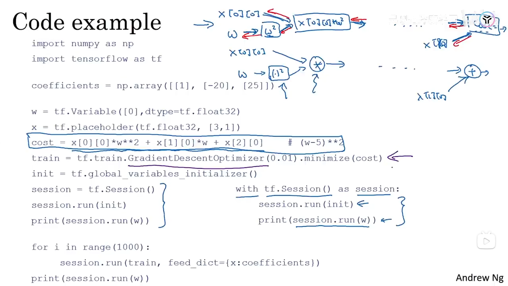 下面是一个应用tensorflow框架的一个示例:在设置成本函数时,框架会构建一个成本函数的计算图,并内置了所有必要的逆函数,方便我们后续进行反向传播,因此无需显式实现反向传播。