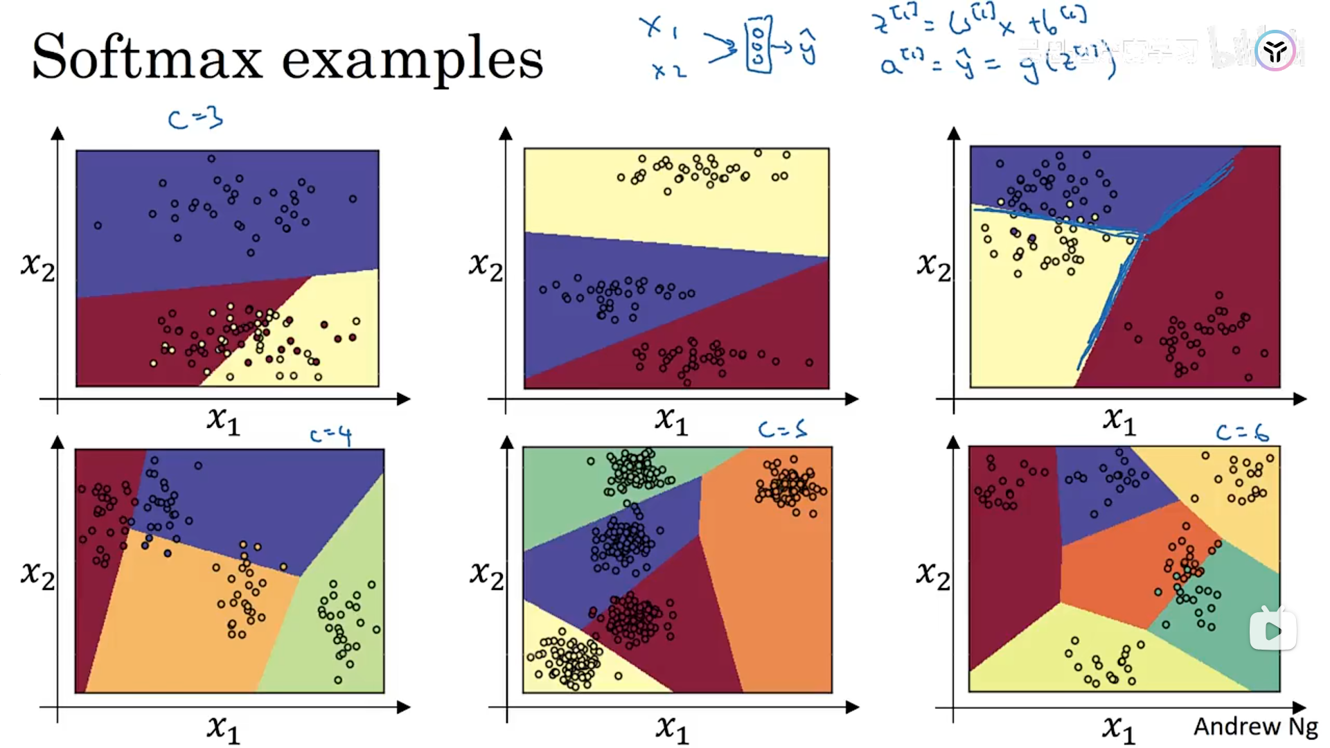 接下来是一些具体的应用示例:softmax分类器可以计算出决策边界,这是没有隐藏层的softmax,线性决策边界;当然使用深度神经网络,输出层用softmax,可以学习到更加复杂的决策边界。