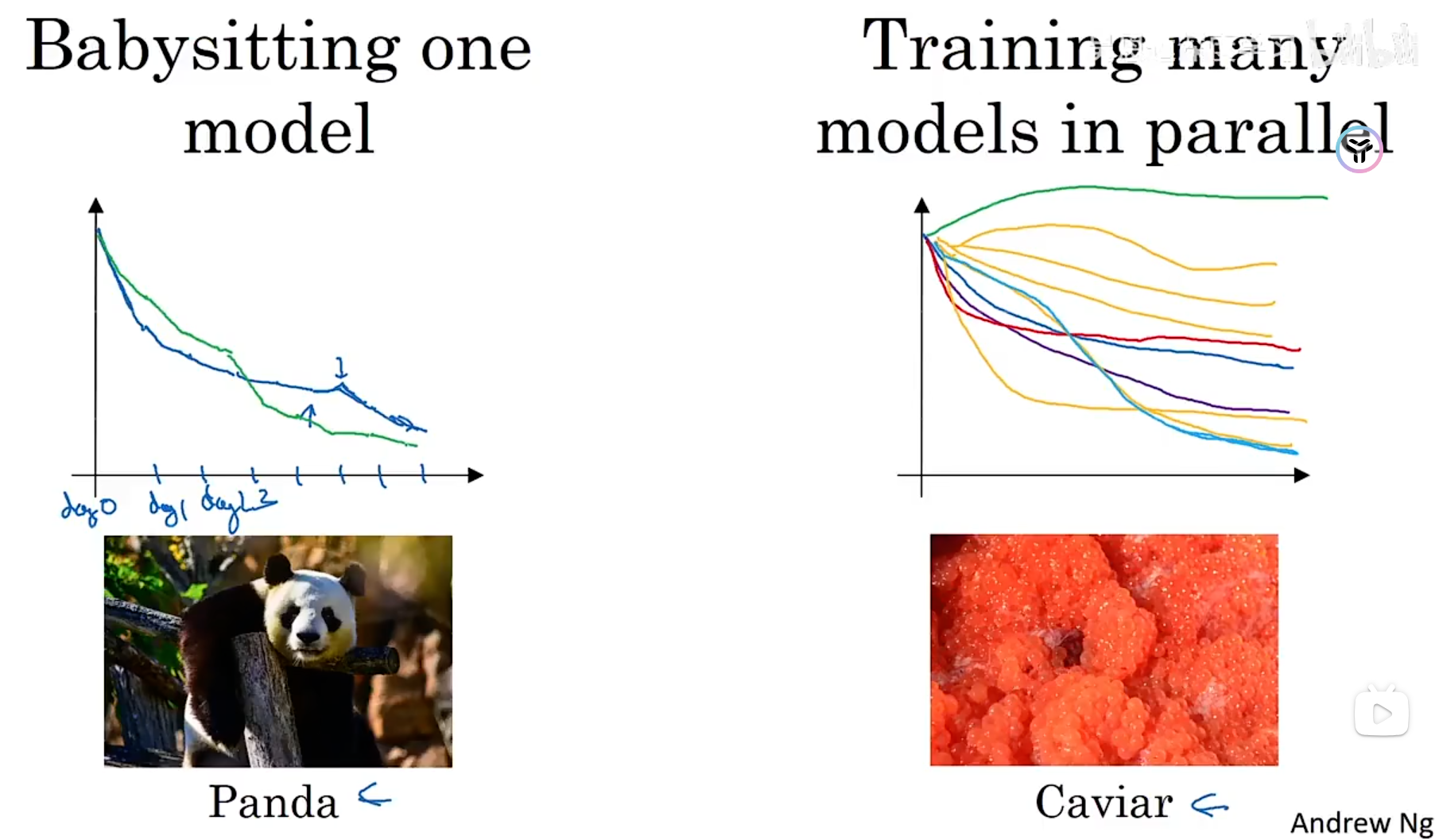 这里提出了两种超参数调试的过程,我们可以根据自己的算力来决定用哪一个,第一种叫做熊猫策略:一次只训练一个模型(没有许多计算资源或足够的 CPU 和 GPU 的前提),只是在不同的阶段调试不同的参数,根据调整的结果不断地进行优化,过程更加细致。第二个调试方式是鱼子酱策略,同时训练多个模型,每一个模型调整不同的参数,观察哪个模型的效果最好。