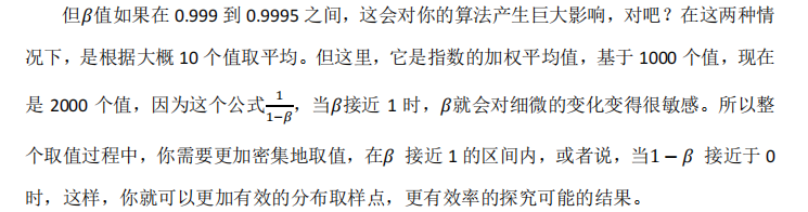 所以,如果你想研究更多正式的数学证明,关于为什么我们要这样做,为什么用线性轴取值不是个好办法,这是因为当𝛽 接近 1 时,所得结果的灵敏度会变化,即使𝛽有微小的变化。所以𝛽 在 0.9 到 0.9005 之间取值,无关紧要,你的结果几乎不会变化。