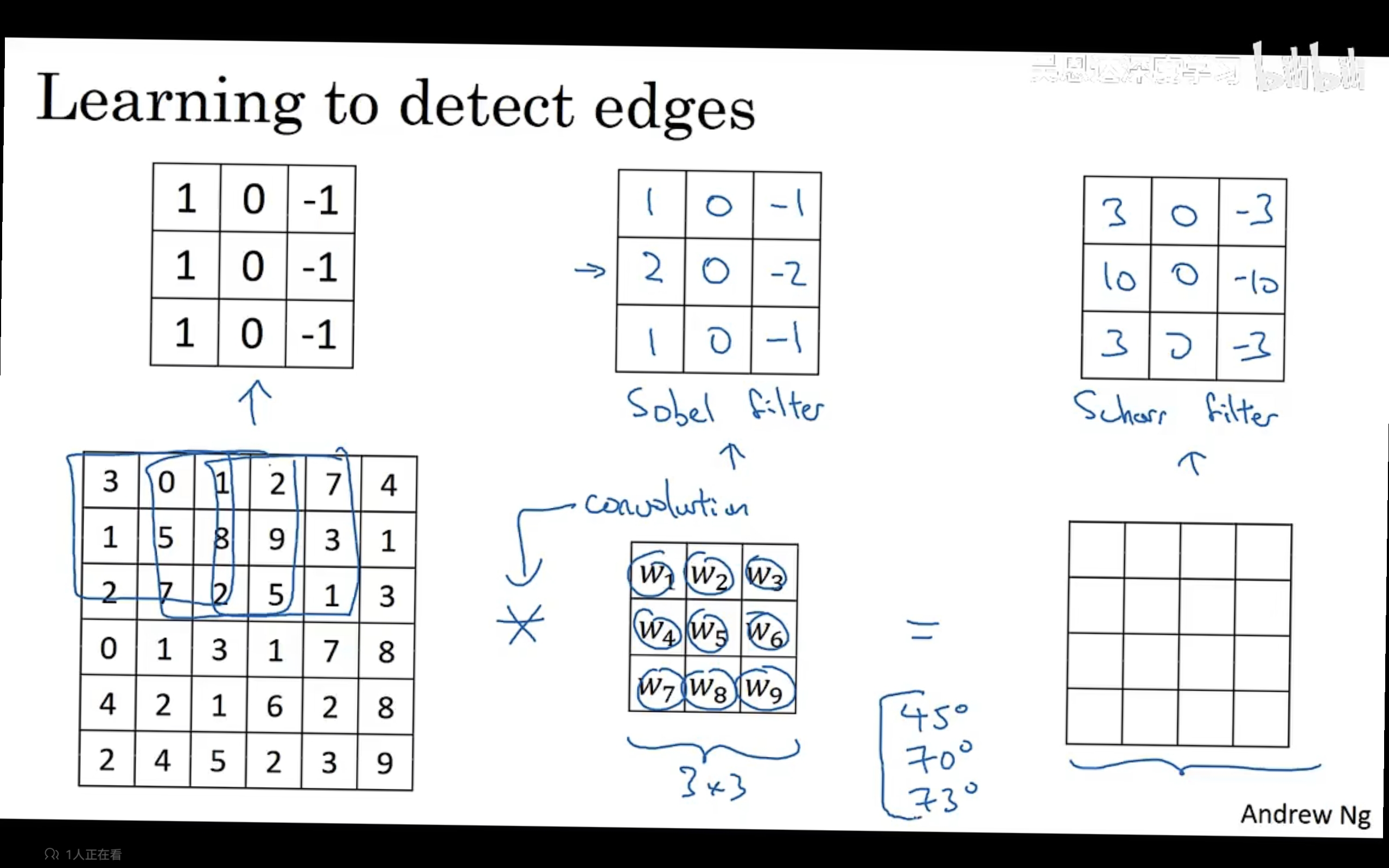 不同的滤波器允许我们找到水平边缘或者垂直边缘。上行中间的被称为索贝尔滤波器(更加重视中间像素),我们也可以将滤波器中的数字作为9个参数进行训练学习,使用反向传播去学习。