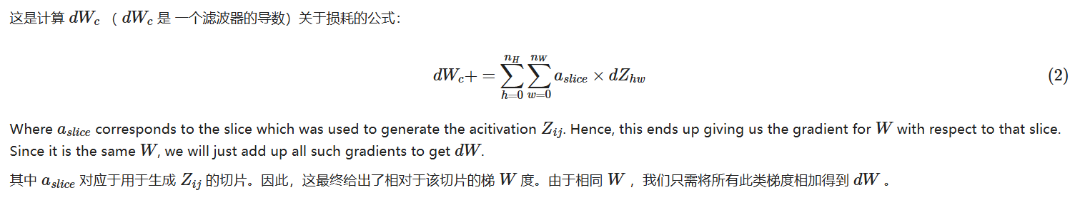 da_prev_pad[vert_start:vert_end, horiz_start:horiz_end, :] += W[:, :, :, c] * dZ[i, h, w, c] # 累加输入梯度