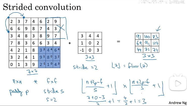 卷积步长指的是我们在卷积过程中进行计算移动时的长度。步长变化之后,我们卷积之后的图像大小也会发生变化,具体变化由下面这个公式来控制:输入的图像大小为nn,滤波器卷积矩阵为ff,填充为p,步长为s,那么卷积之后的图像大小围为:(n+2p-f)/s+1 * (n+2p-f)/s+1.如果这部分的计算结果不为整数,则对它进行向下取整,在计算过程中,如果对图像的卷积部分有一些是悬挂在外面的则不进行计算(滤波器需要完全在图像内获图像加填充区)。