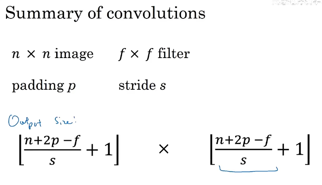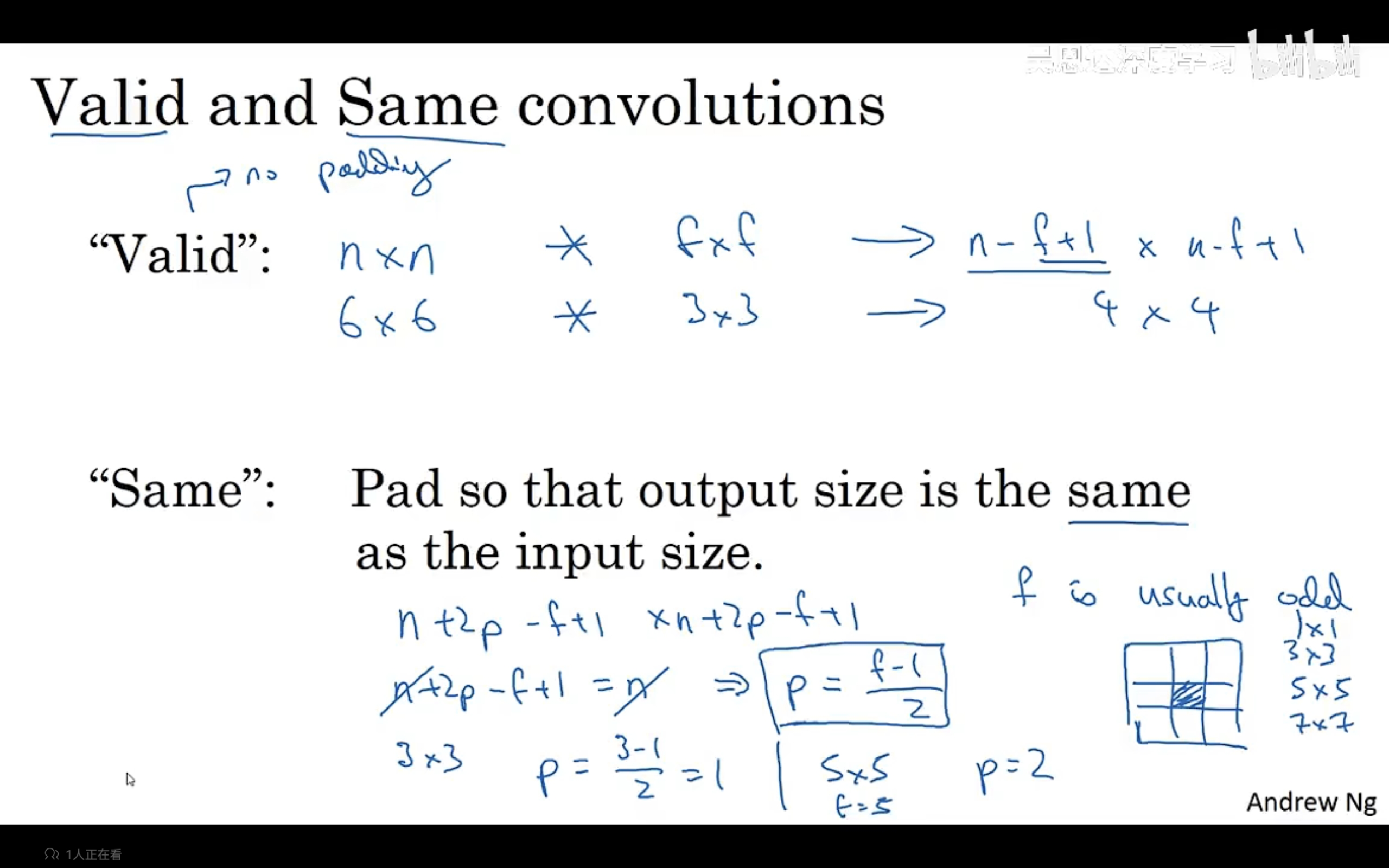 计算机视觉中,f的大小几乎总是奇数,可能有两个原因,f为奇数,在进行填充时能够更方便,对称地进行填充,第二个是奇数有中间位置,在计算机视觉中比较好。