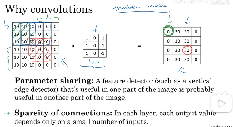 参数共享主要体现在:对于垂直边缘检测器,在图像一部分有用,可能在另一部分也有用,如果已经找出一个滤波器检测垂直边缘,可以在下一个位置应用相同的滤波器。通俗来讲:对于输入数据中较为相似的部分我们可以使用相同的参数来进行计算(我理解的)。连接稀疏:卷积之后的每一个输出可能只来自于输入的某一部分进行卷积得到的,而不是所有的数据。