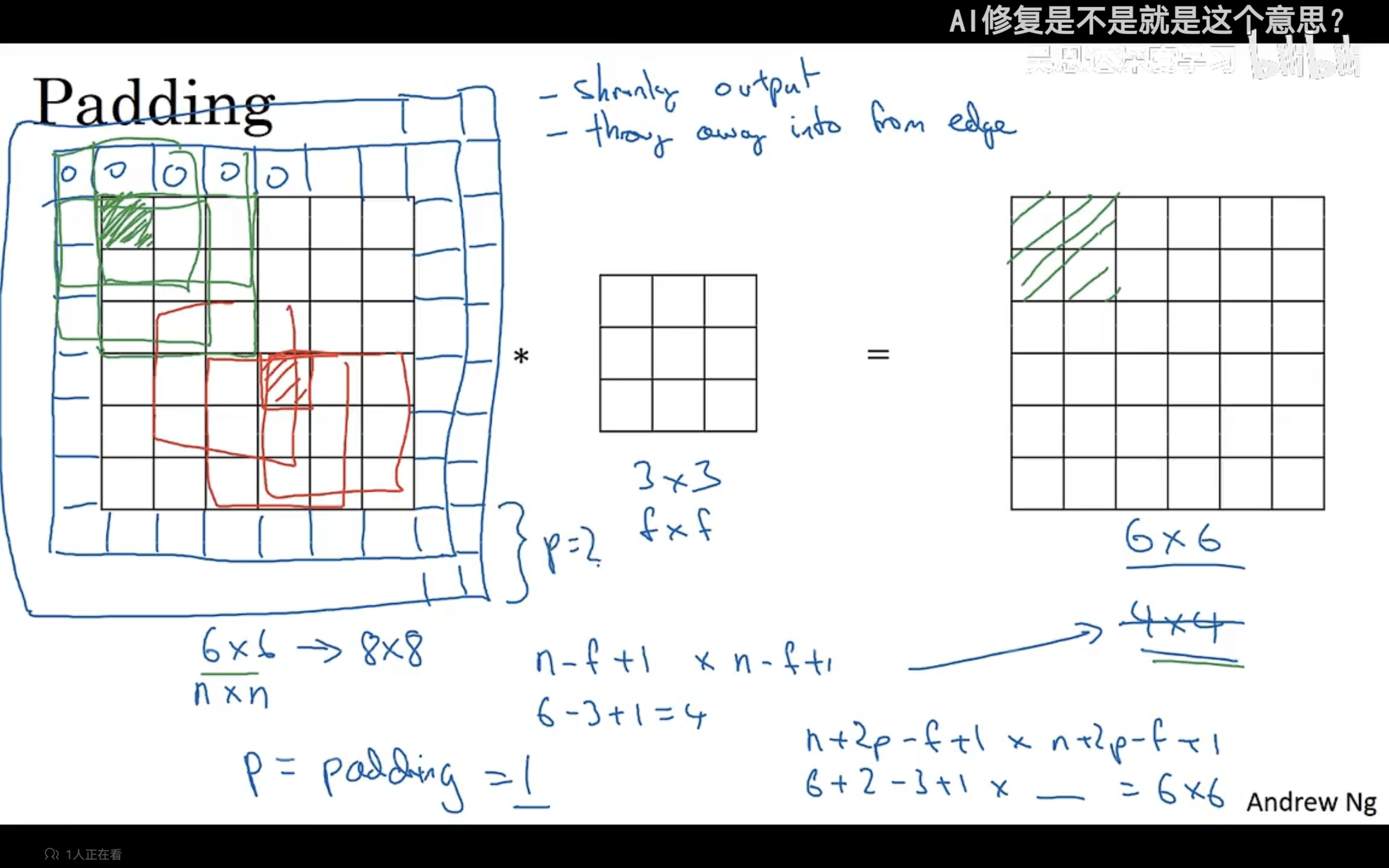 这时候如果我们为图像每个边添加p像素,卷积之后的图像矩阵大小就为(n+2p-f+1)×(n+2p-f+1)。