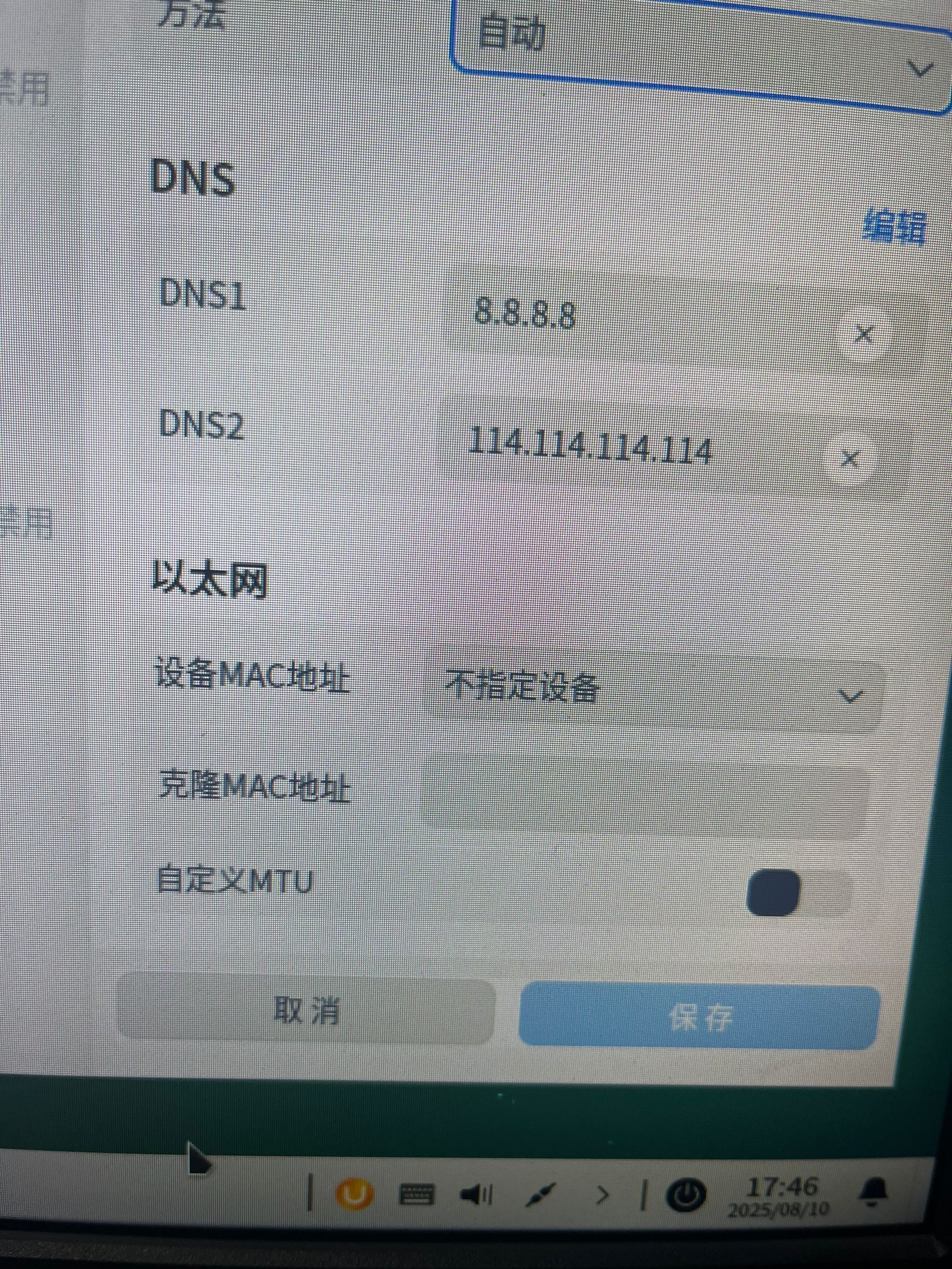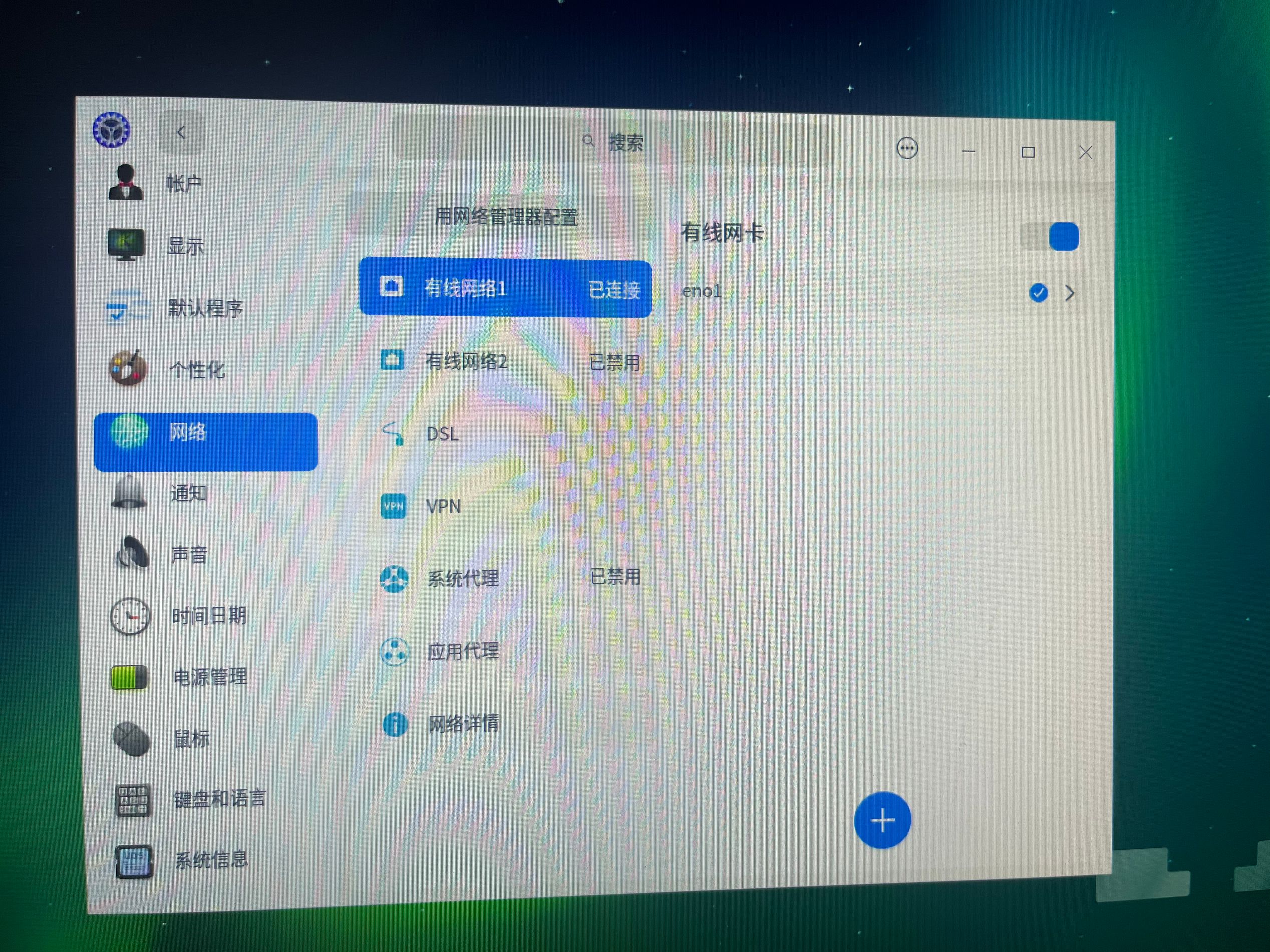 打开 设置→ 网络 → 有线网络1/无线网络2 → 选择eno1→ 编辑连接 → 选择 手动 模式,填写正确的IP、子网掩码和网关。