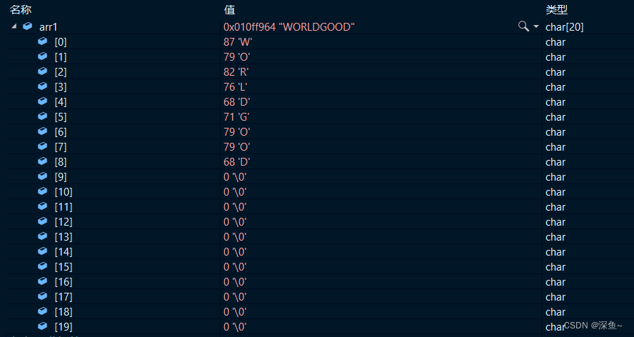 strcpy后的arr1: 可以看到下标为5的元素就是'\0'