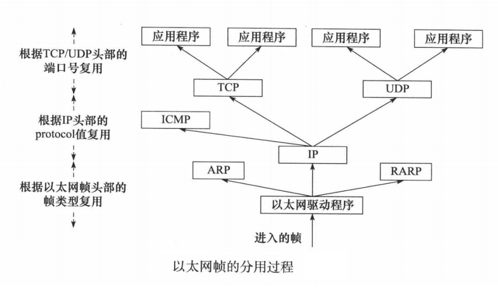 当帧到达目的主机时,将沿着协议栈自底向上依次传递。各层协议依次处理帧中本层负责的头部数据,以获取所需的信息,并最终将处理后的帧交给目标应用程序。这个过程称为分用(demultiplexing)。分用是依靠头部信息中的类型字段实现的。
