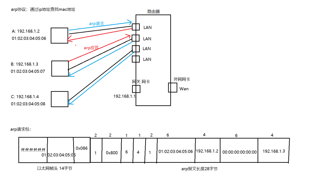 给局域网内的所有的机器发送ARP请求,然后通过数据报中的目的端IP地址来响应(是否匹配),匹配就应答。