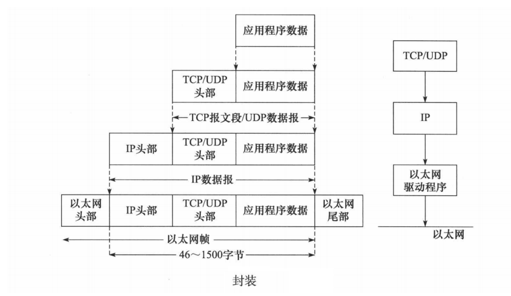 上层协议是如何使用下层协议提供的服务的呢?其实这是通过封装(encapsulation)实现的。应用程序数据在发送到物理网络上之前,将沿着协议栈从上往下依次传递。每层协议都将在上层数据的基础上加上自己的头部信息(有时还包括尾部信息),以实现该层的功能,这个过程就称为封装。