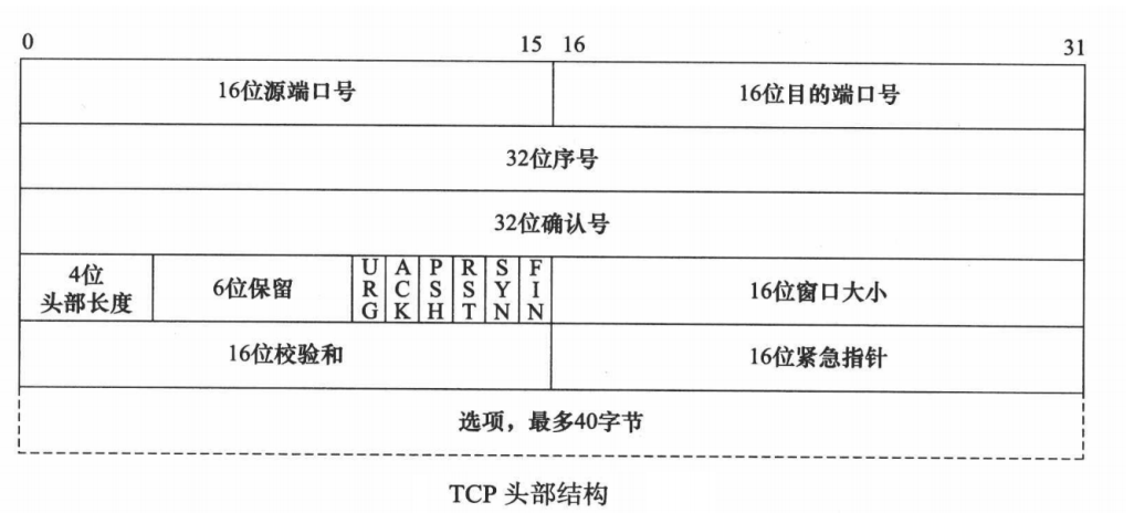 16. 选项:长度可变,最长可达 40 字节,当没有使用选项时,TCP 首部长度是 20 字节。