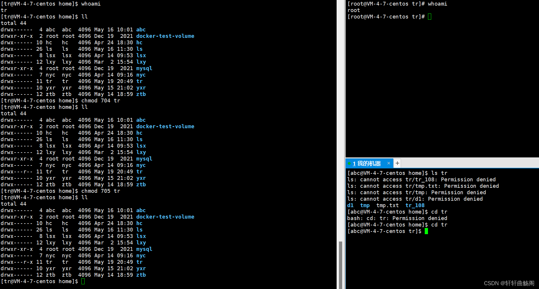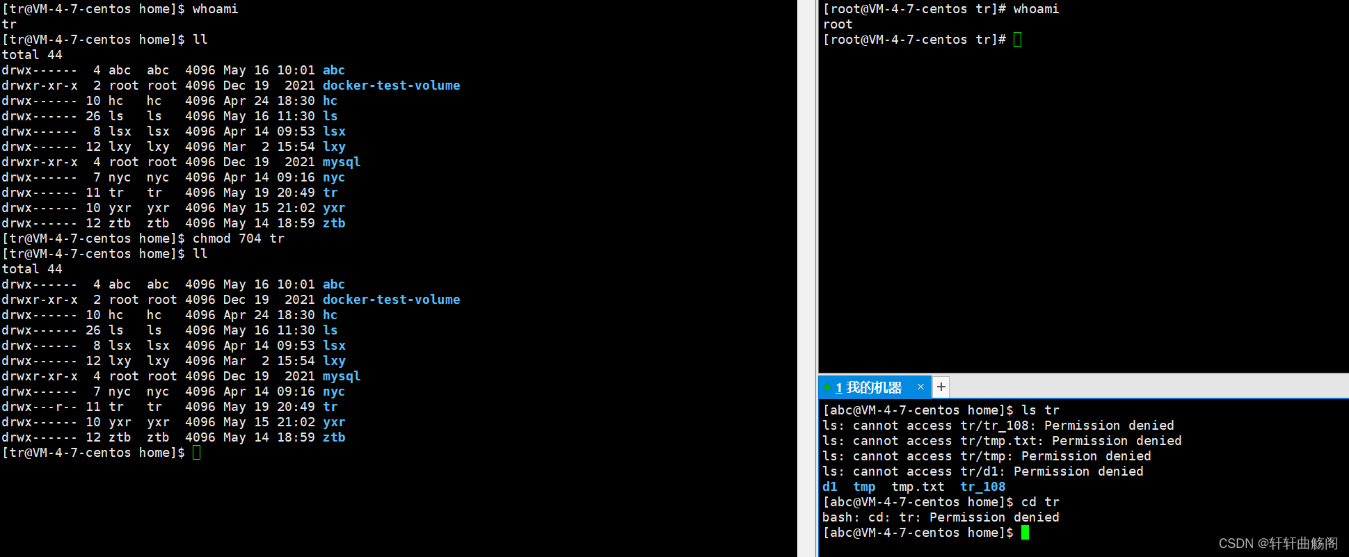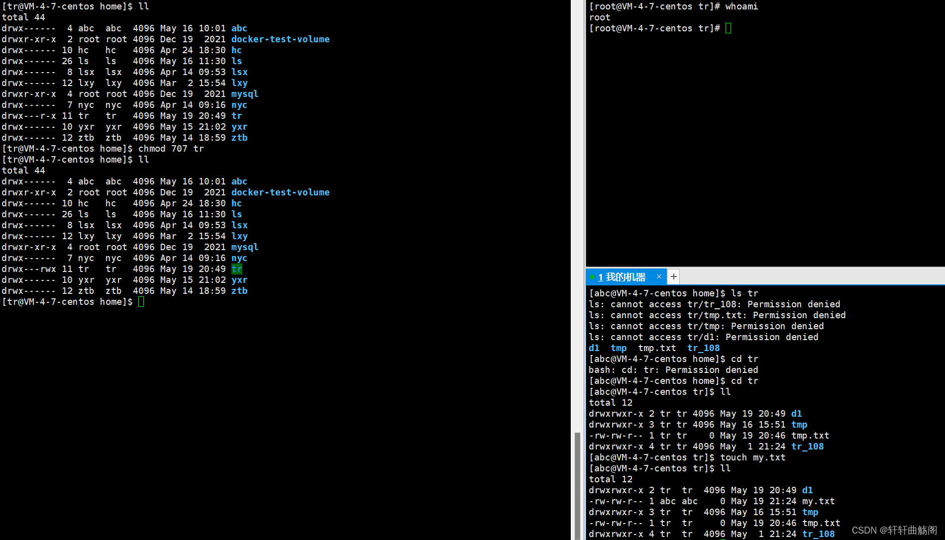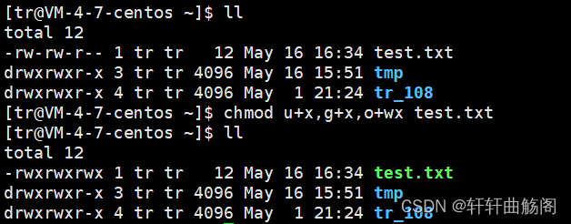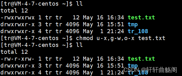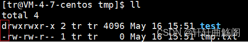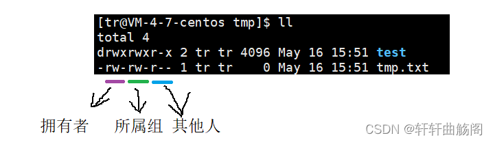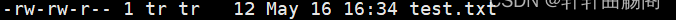 这之后的数字表示了该文件的硬链接数,在这之后第一个 tr 表示的是该文件的拥有者,第二个 tr 表示的是该文件的所属组,如果不在这两个之中,则表明是其他人。然后依次是文件大小、最后的修改日期、文件名。