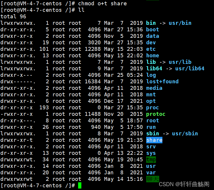 在有些时候,我们需要共享数据,而在home目录下创建的文件只属于文件个人,因此我们在根目录下创建一个共享文件share