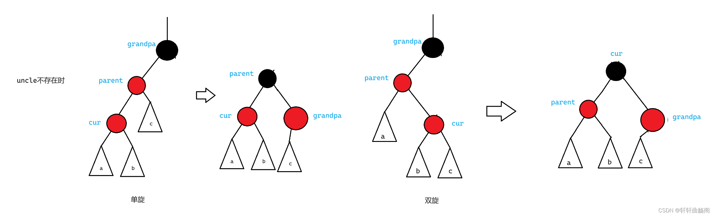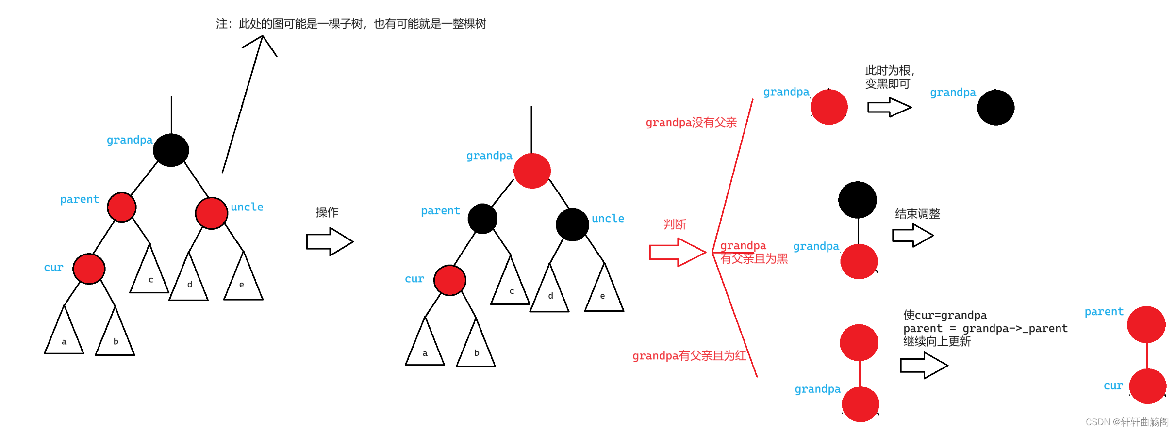 观察上述例子之后可以发现,这两种情况本质上可以当做同一操作,那就是先判断grandpa、parent与cur的关系,然后根据具体情况进行旋转,旋转之后进行变色,因此抽象图如下