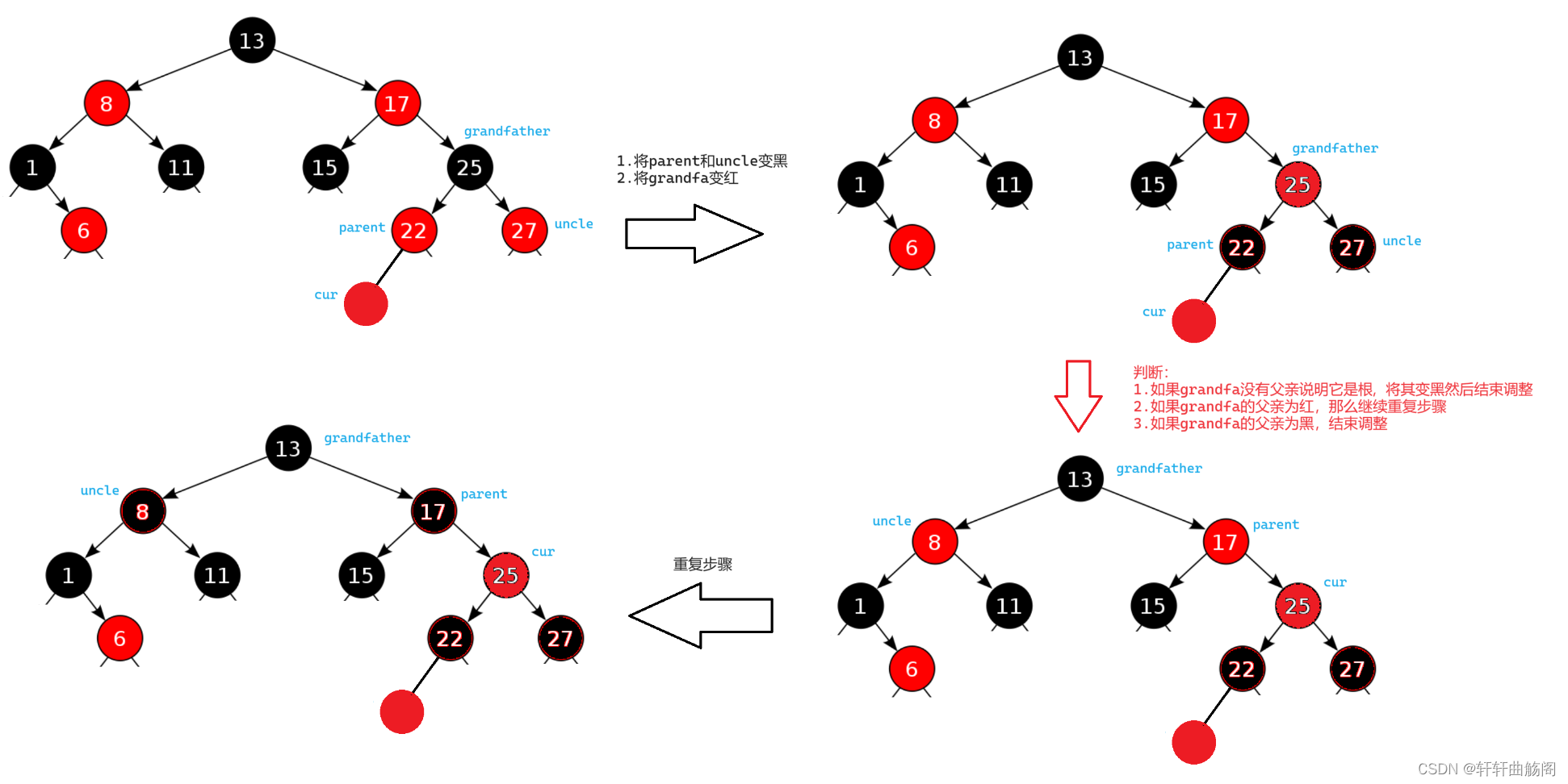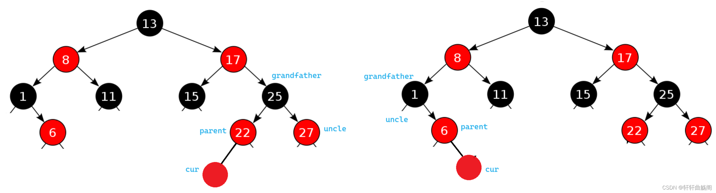 以上面的红黑树为例,在parent为红的情况下,插入之后的情况可以将它们大致分为两种:1. uncle存在且为红;2.uncle不存在或uncle存在且为黑。让我们来分析一下,在这里我们依旧采取先具体后推广到一般的方法
