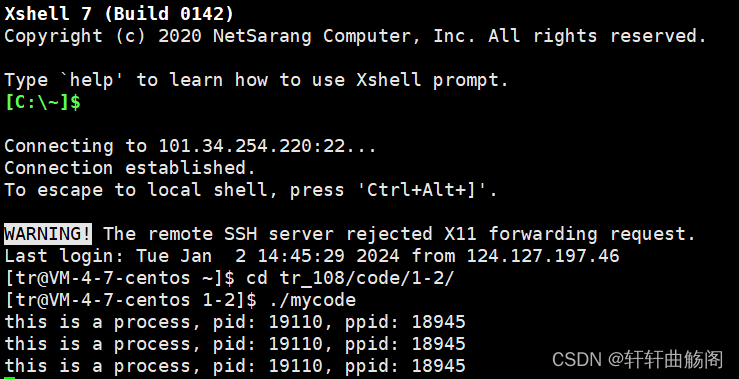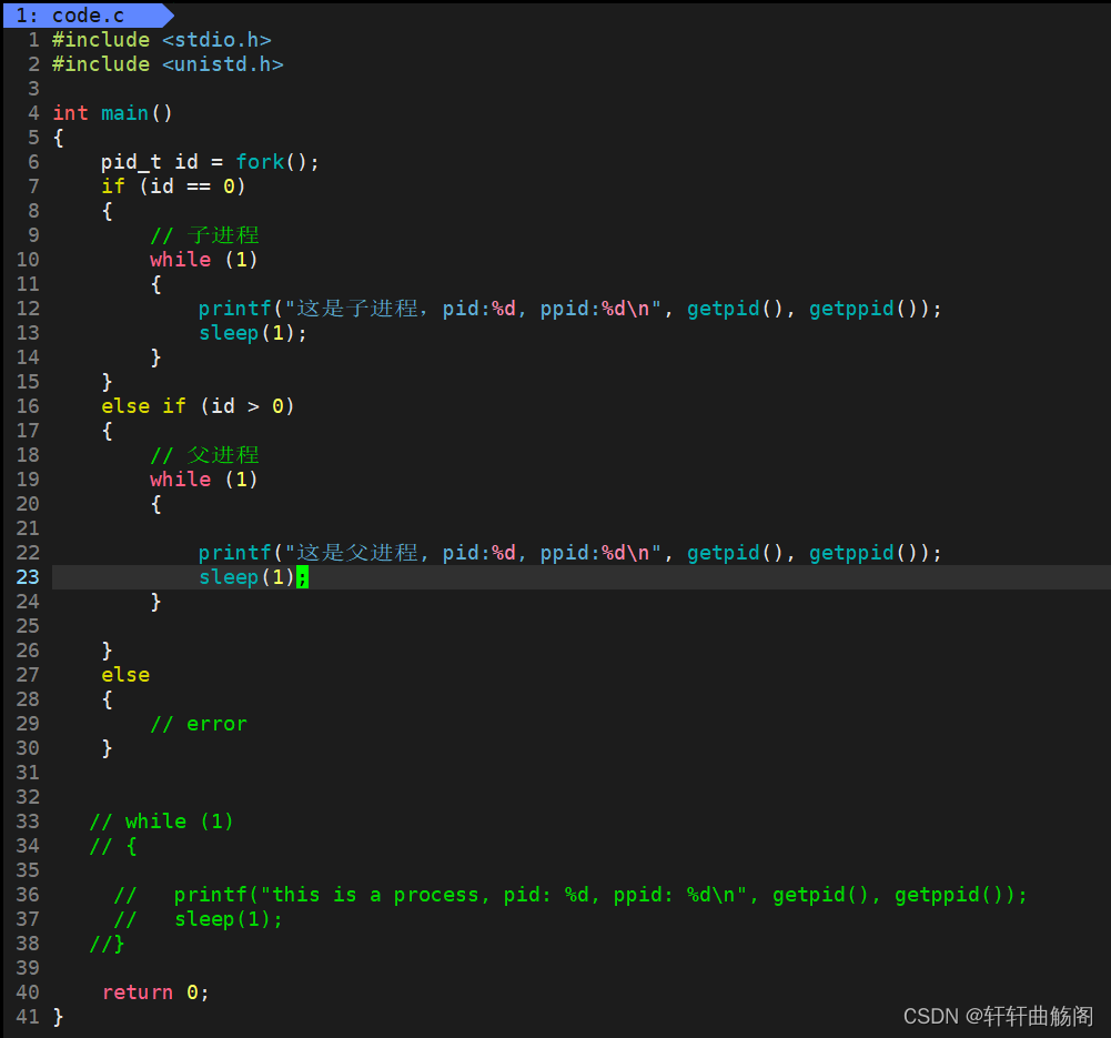 可以看到在手册中提到fork会返回两个值,返回id==0时,标识其为子进程,id>0时,标识其为父进程,而在运行结果中我们可以看到,父进程就是当前进程,子进程是新分支。至此,我们对于创建一个新进程有两种方法,其中一个就是使用./文件的方式在指令层面创建一个进程,另外一个就是使用fork函数在代码层面创建一个进程。其实在调用fork函数之后,会产生两个执行流。