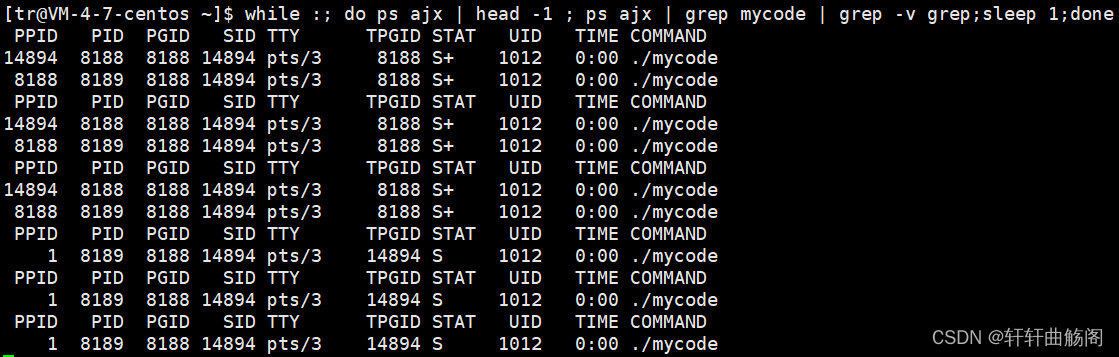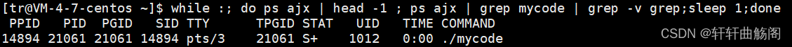 while :; do ps ajx | head -1 ; ps ajx | grep mycode | grep -v grep;sleep 1;done