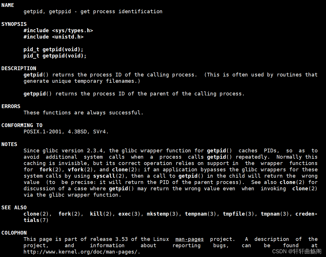 首先我们要知道PID是存放在task_struct中的,在我们使用ps命令时,它的本质就是遍历一遍task_struct链表,那么我们怎么获取呢——Linux肯定是不希望我们直接通过使用域访问符.来取得PID的,因此它提供了一个系统调用的接口即函数getpid(),它的手册如下