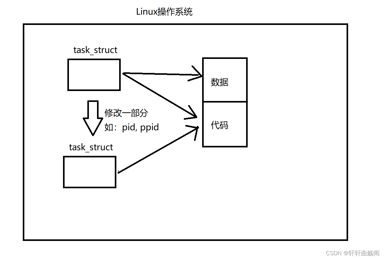 而对于fork来说,他是一个函数其内部也有其自己的实现,其内部可能包含:1. 创建子进程task_struct; 2. 填充task_struct;3. 让它指向同一份代码;4. 使它可以被自由调度;......在完成了这一系列的任务之后,子进程已经被创建好了,此时由于父子进程共享同一份代码,到最后的return 语句时,父进程与子进程会各自返回一次数据。
