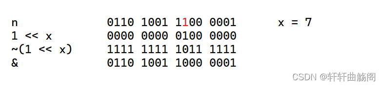 要想修改x位置的值为0,只需要对这个位置&上一个0,其余位置&上1,这样就可以将该位置修改成0,即