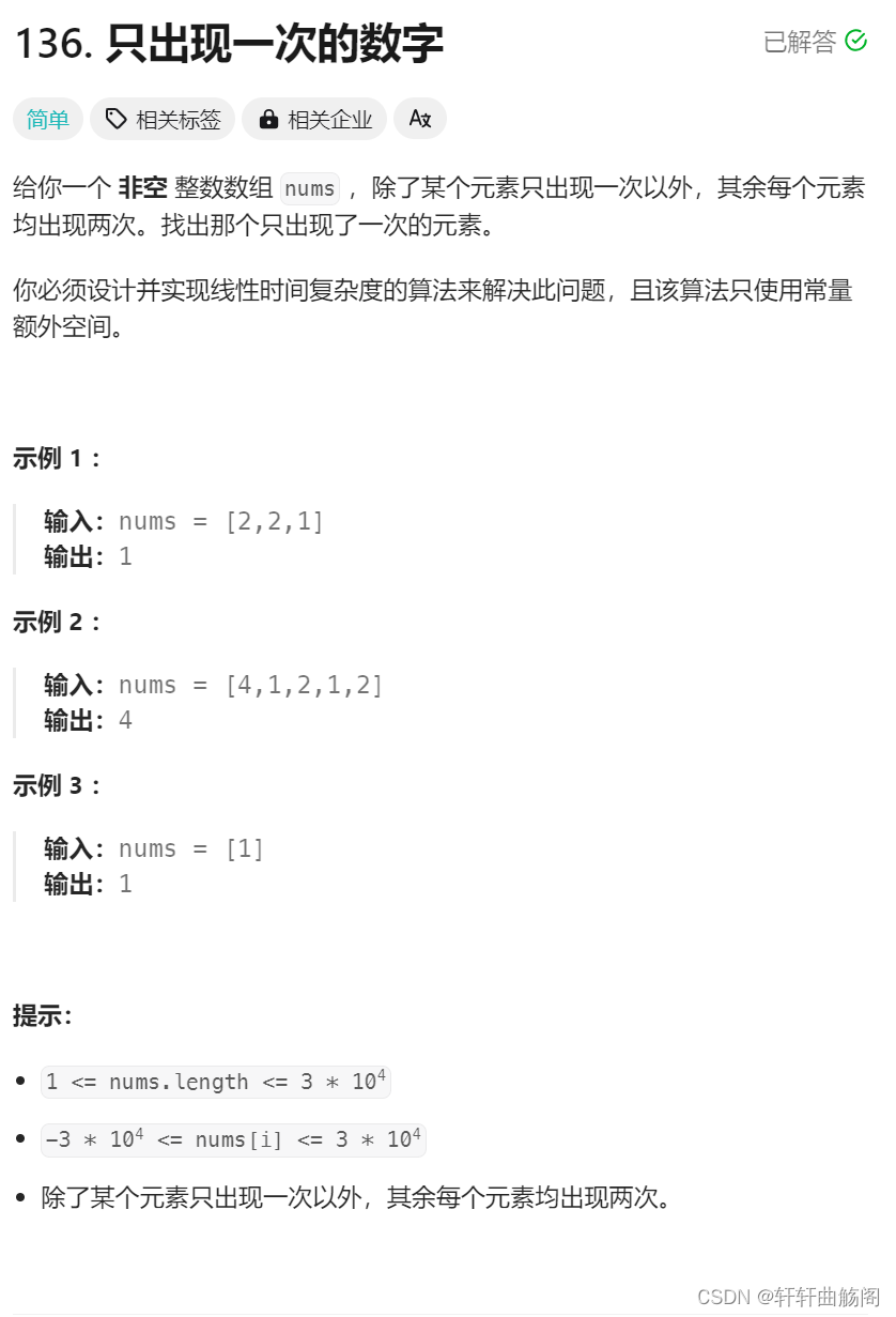 题目链接:136. 只出现一次的数字 - 力扣(LeetCode)