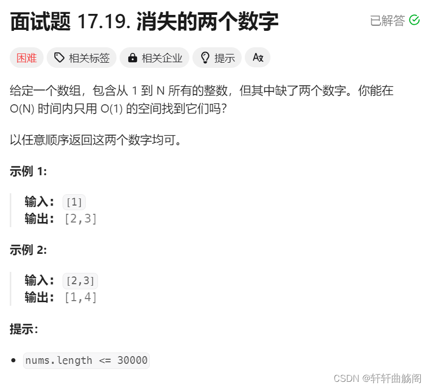 题目链接:面试题 17.19. 消失的两个数字 - 力扣(LeetCode)