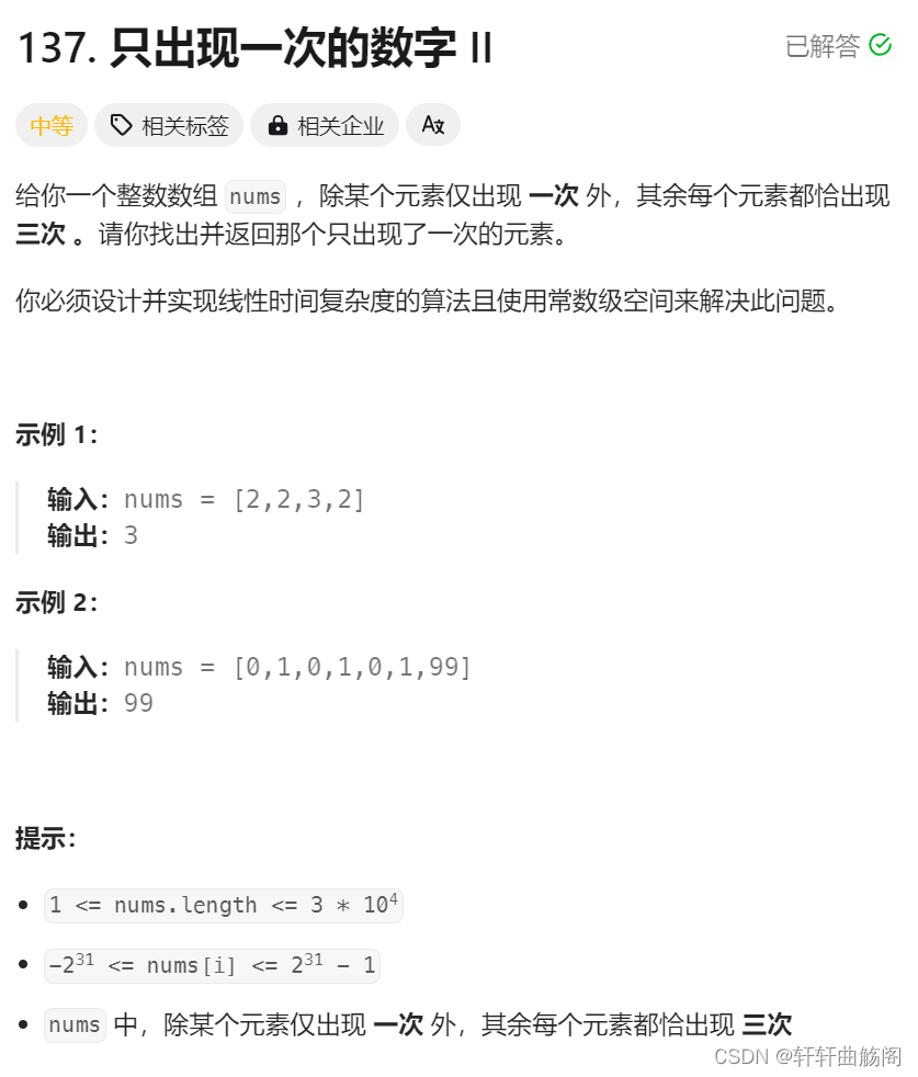 题目链接:137. 只出现一次的数字 II - 力扣(LeetCode)