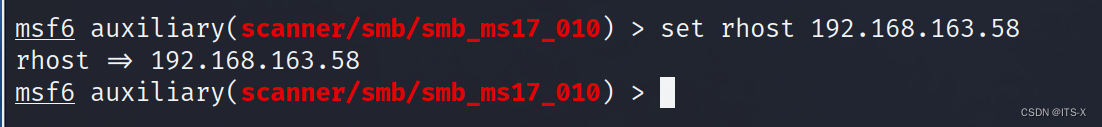 这里提示,必须设置的参数中,唯有rhosts目标主机IP地址没有设置,我们设置目标主机的IP地址为“192.168.163.58”,为靶机的IP。