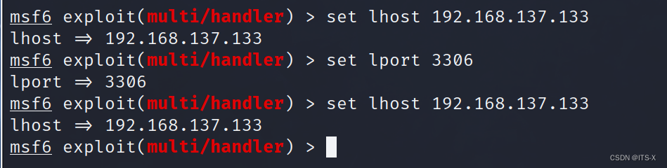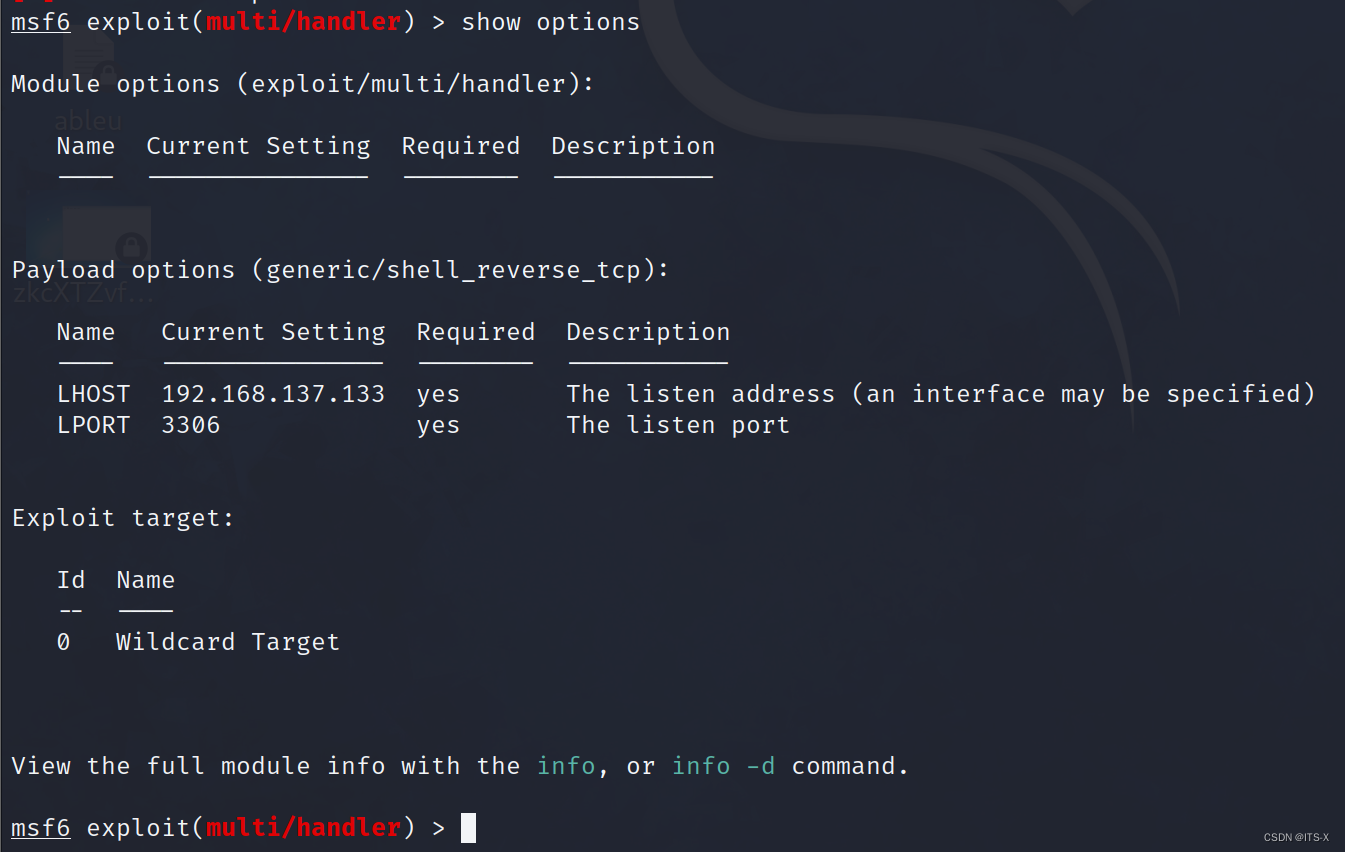这次需要设置的参数有一个,还是目标靶机的IP:但是为了我们实验的严谨性,我再把监听服务端的IP重新设置为渗透机本机的IP。