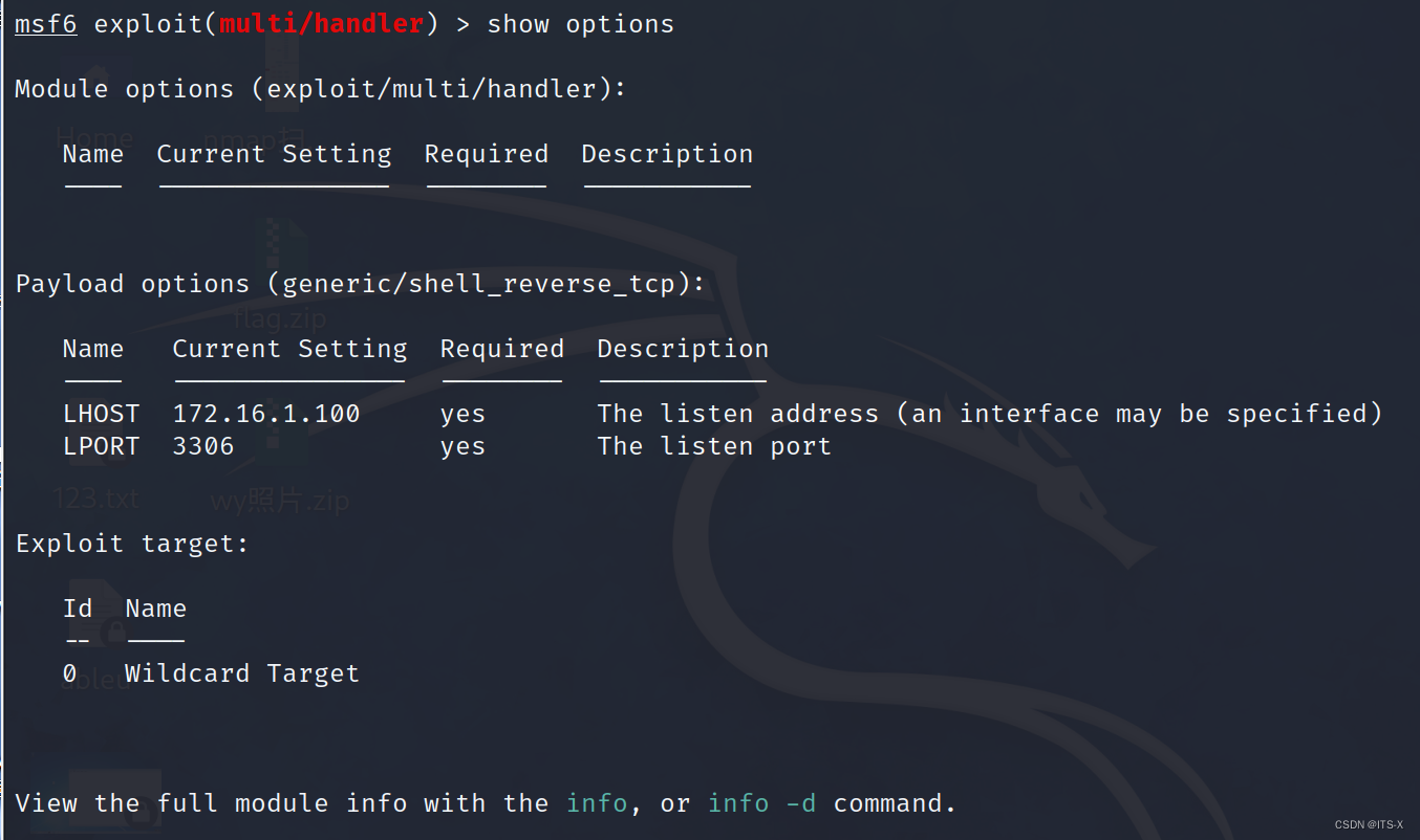 我们返回msf控制台的监听控制台(第一次尝试监听的模块),查看需要调整的参数。