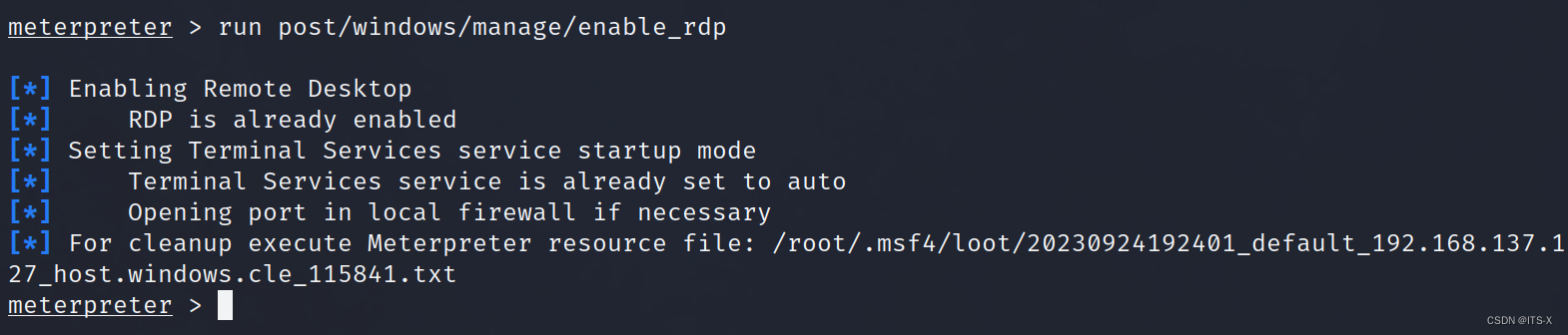 后门用户创建完成。我们可以直接使用rdesktop登录远程桌面,如果3389端口没开启的话,需要在后渗透控制台利用模块开启,当然吗,在shell中也是可以开启的。